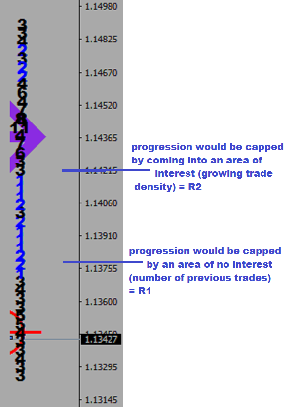What you need to understand here is that the single prints (ones, twos) are representing the absence of time spent in the area, which comes with lack of interest. People are holding their trapped positions in the blacks, and they cover in the vacuum for a better than break even.