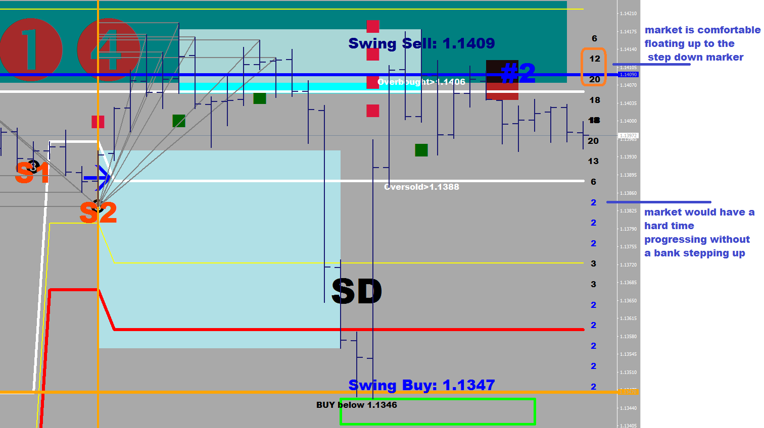 Progression in the blue areas is relatively quick because of having not too many orders (but requires continuous buying/selling at market by someone with funds), other than at the step down area, which may cause a reaction first.
