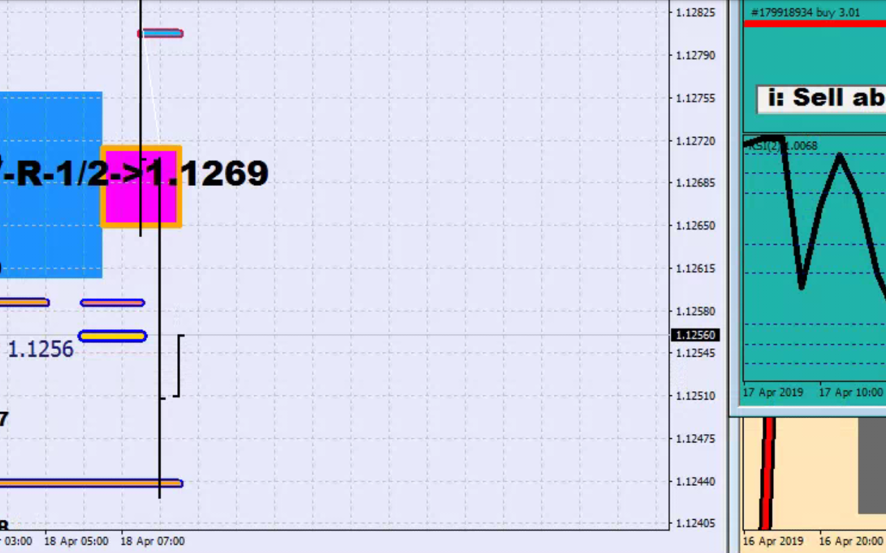 Why did I sell at the price level on the above image? Because price walked into the net of the last RSI2 divergence (after printing an RSI2 Sharpie at the bottom – purple square). See, price does not have to stop dead at the RSI2 divergence plot, it may exceed it by 1/2 fluctuation size which is 16 pips on the EUR/USD. Only upon exceeding that would I consider the divrgence failed. And if you look left there are additional untested RSI2 reversal divergences nearby. These 4 altogether (one is no longer plotted, the 4th – it has its end at the last upper sharpie) would make for a rather tall order to overcome.