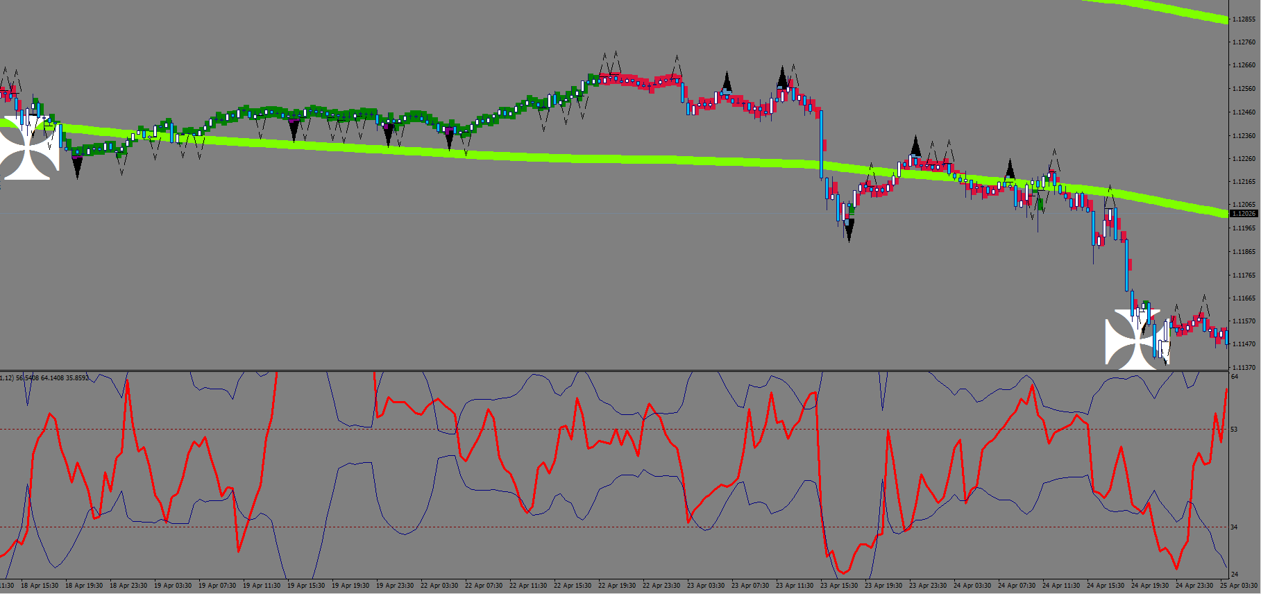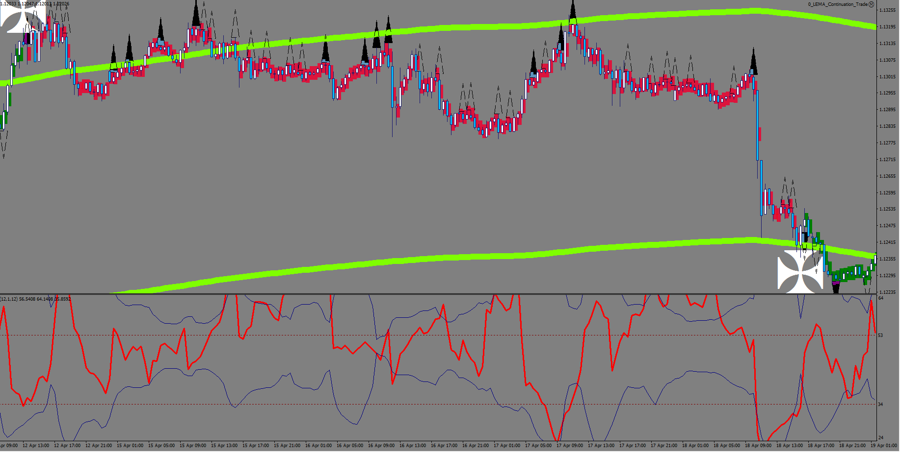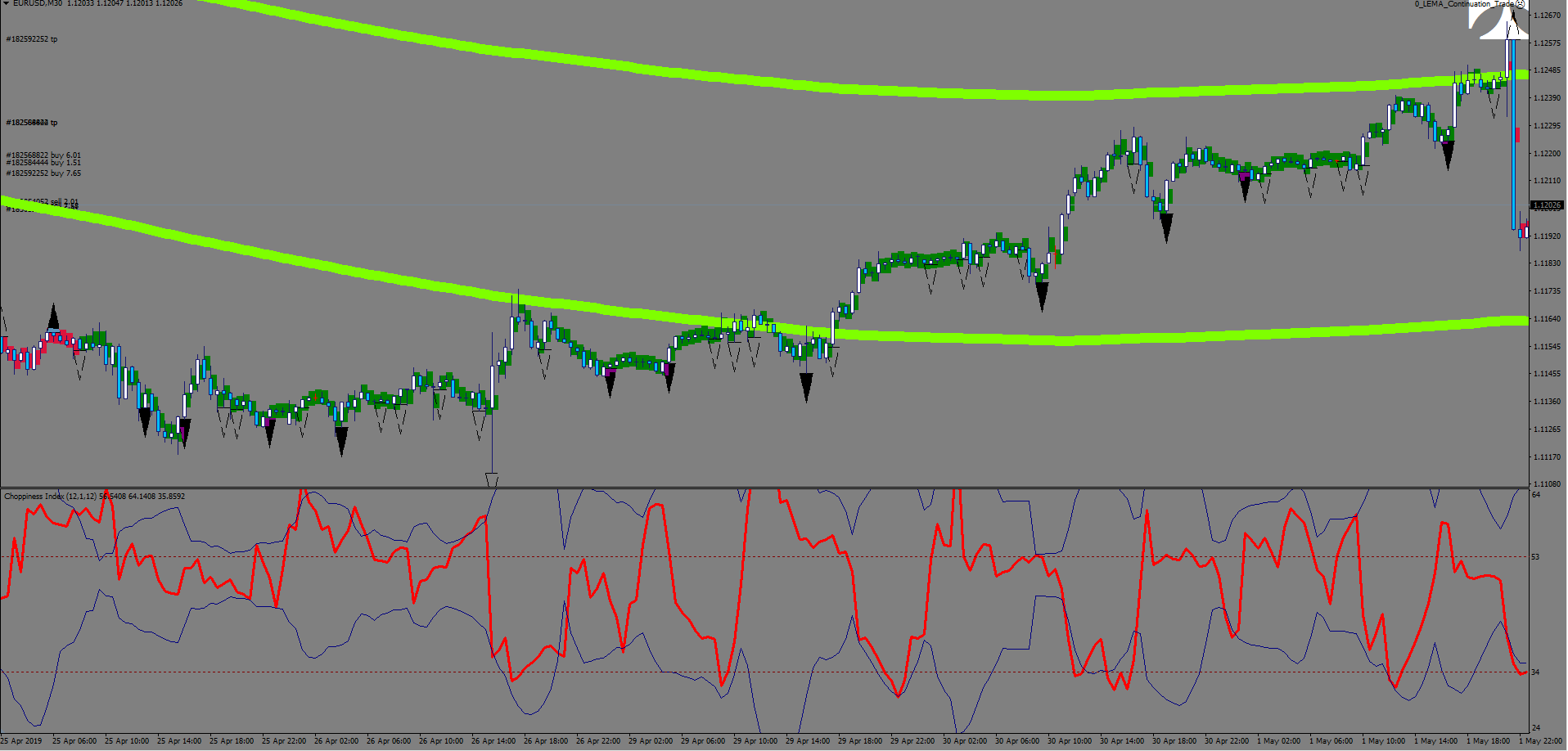 As for an additional deciding factor, I started plotting again a 12-sample choppiness oscillator – I intend to measure bull/bear strength with it.