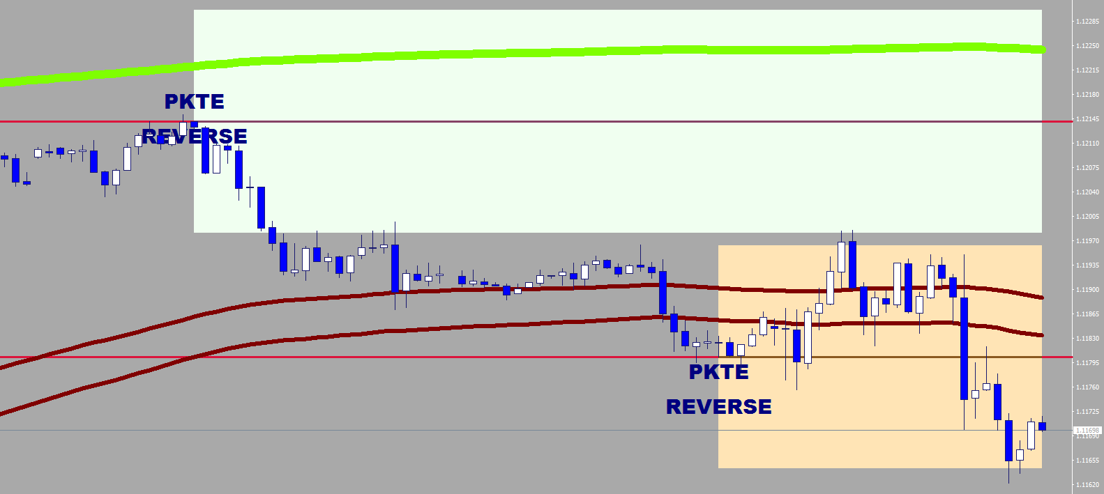 During peak trending, if an exhaustion is made, the trend turns on itself and reverses. The PKTE REVERSE texts and the crossing point of the vertical rectangle line and the horizontal red lines are highlighting the 30-minute high and the low where the 7-sample exhaustion had its relief. These axles are the mid points of the rectangles that have two equal halves, 1/2 Fluctuation size each.