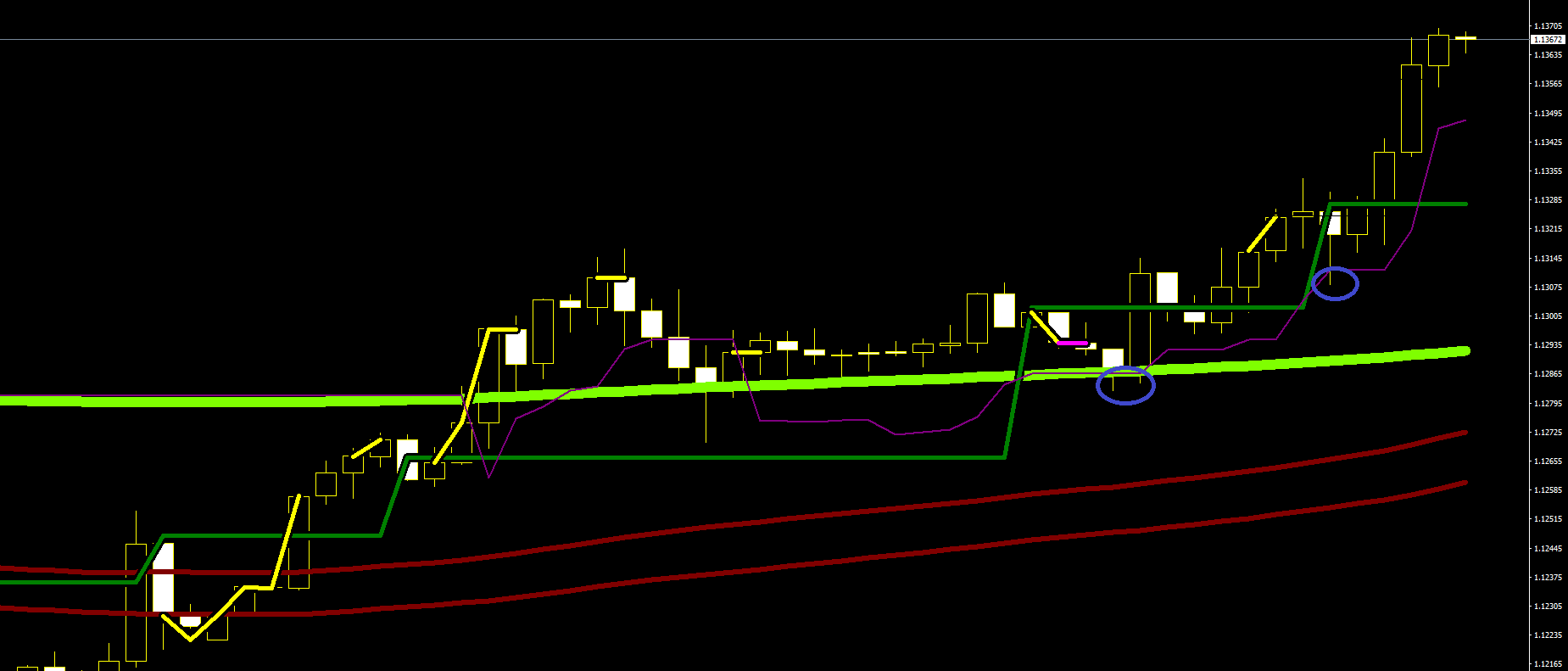 It could come in handy to plot exhaustion levels: closing out your positions in gains may turn out to be fruitful in obtaining a weight further out (and yield some extra cash). The squaring levels are the exhaustion highs / lows and the ends of the red tails. (Red horizontal lines on the image).