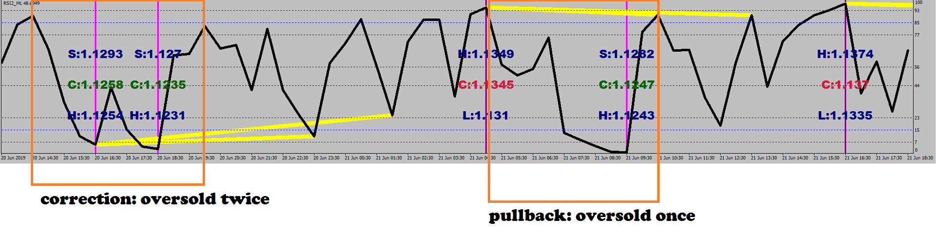 About the upcoming correction: it would go oversold twice = there would be 2 measuring legs down, and the second one would ultimately adjust the channel low.