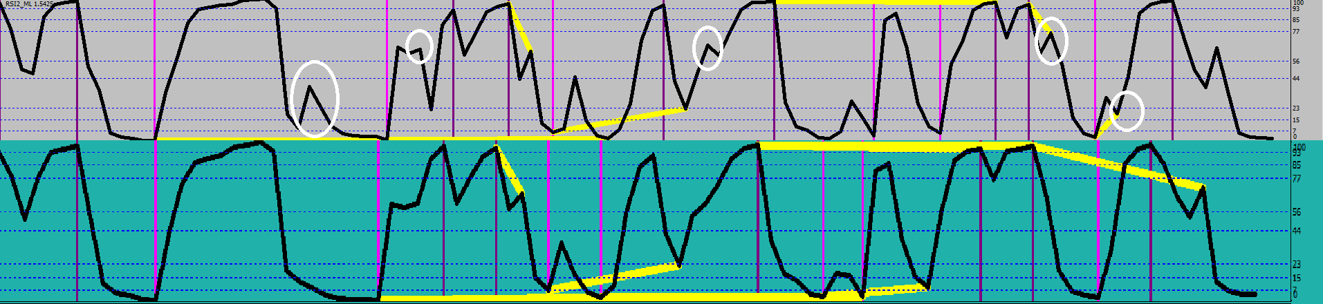 The image above shows the same iRSI(symbol,0,2,PRICE_MEDIAN,i) expression, yet the outcomes on the two different brokers are drastically different. White circles are only some high lights.