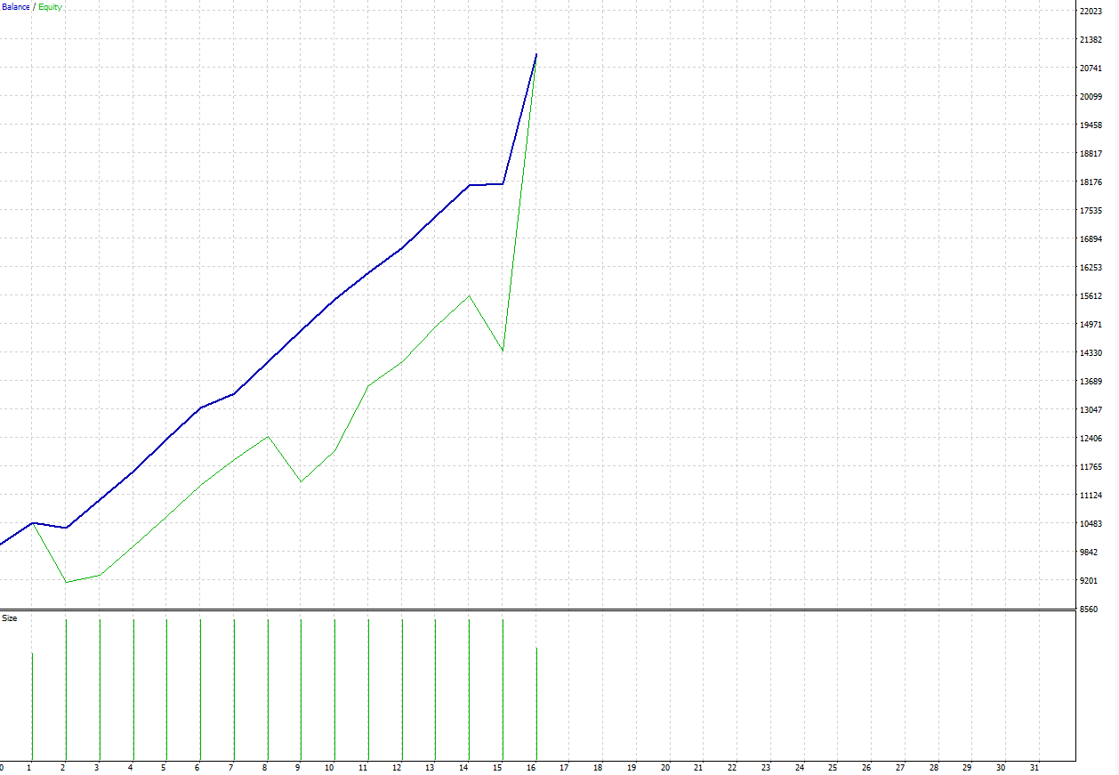 The green equity line separating from the blue balance line shows the presence of a hedge-trade. When the green gains on the blue, a hedge-trade gets closed out. At the meeting point the account has no open positions.