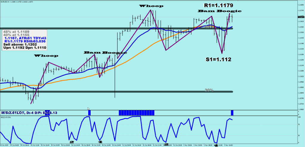 Although they are certainly not identical, they have commonalities. Three attempts to take the price as high as possible is one of these. In both cases, 2 out of the 3 peaks managed to achieve overdrive prints on the stochastic bars. Both wave structures had #4 undercutting #2 which speaks of a corrective wave structure (by this I mean you should start fading heavily by the time wave 5 is up). In both cases, wave 5 fell short of the overall peak, and they were less than 5 hours long.