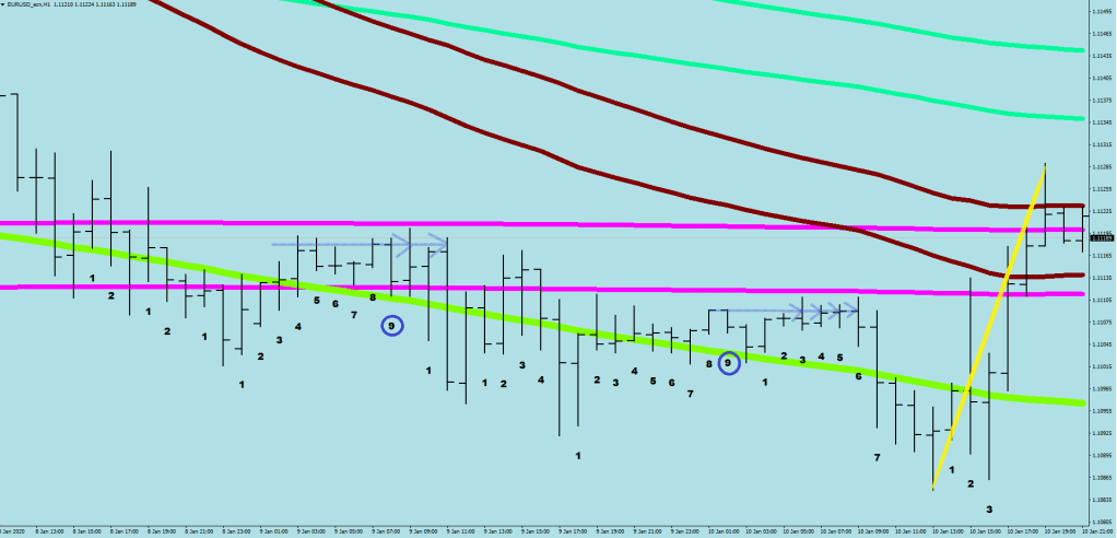 Once you have printed 9 on the counter, you most likely have seen the resistance level already. Your aim is a lower low – trail stop advised, for there is directional rotation in these zones: people get put with the bag.