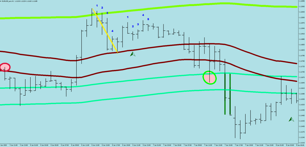 Once price had engaged the 1-time-plus stretch zone from the mean (by making two highs above the upper guard rail or two lows below the lower guard rail), the rules become rather simple.