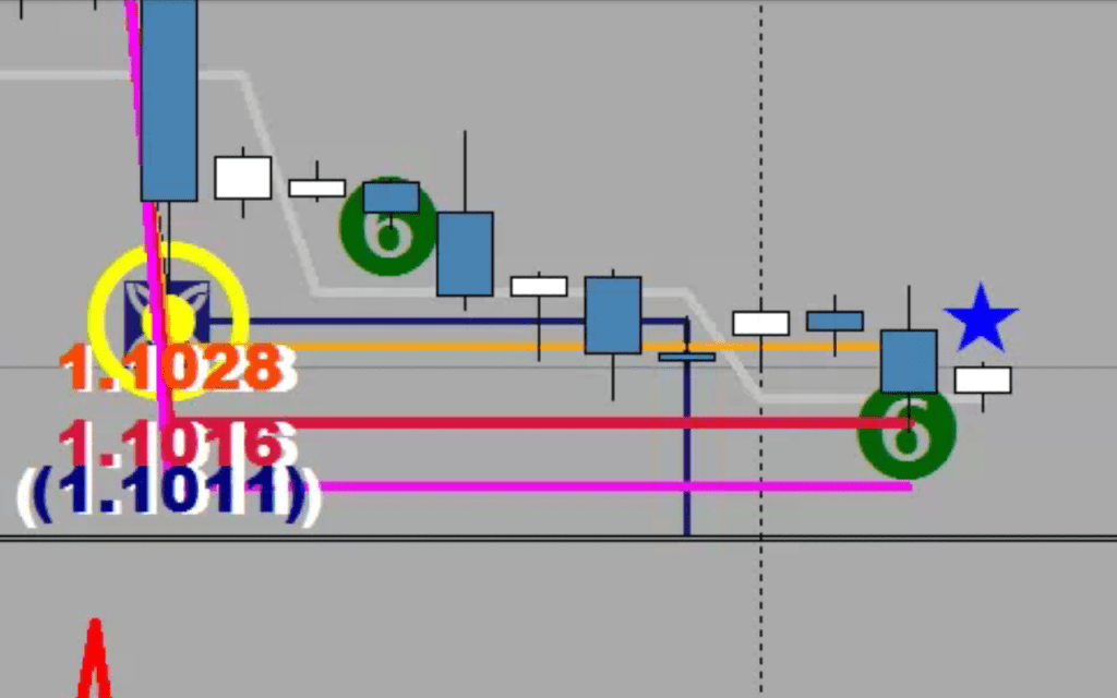 The count up started from the fresh lower low. When the count reached 9, and the bulls failed to make a Wave 1 up by reaching the Market Maker stronghold (Mr. Maroon), you had the continuation sell level on your screen (the highest open / close of those 9 bars & beyond).