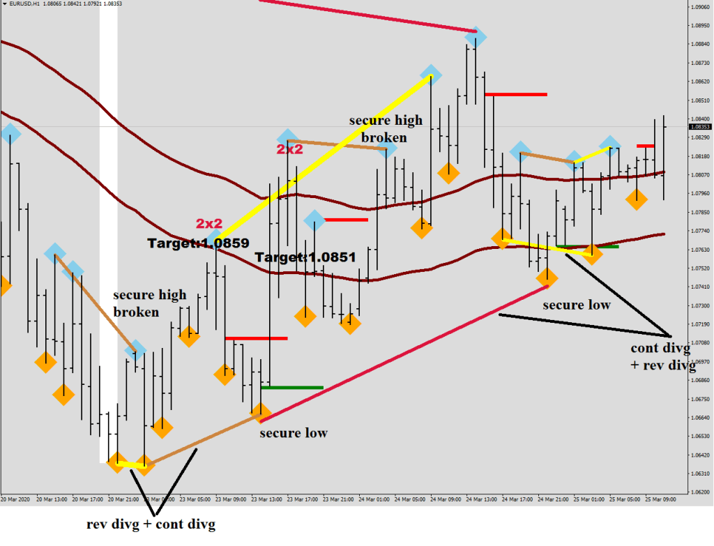 Price had a smack down at Mr. Maroon which resulted in a higher, secure low as the continuation divergence underlined it. (Starting point of Wave 1 up).