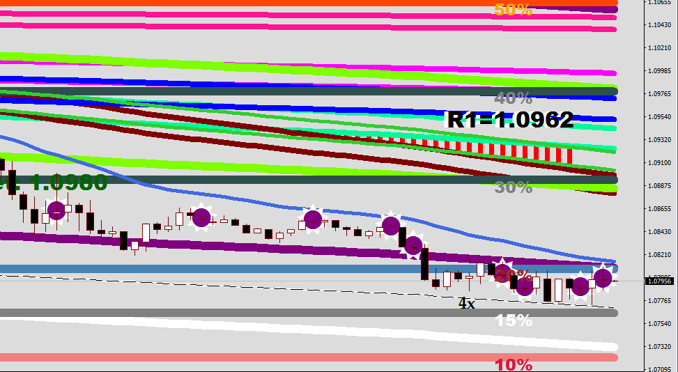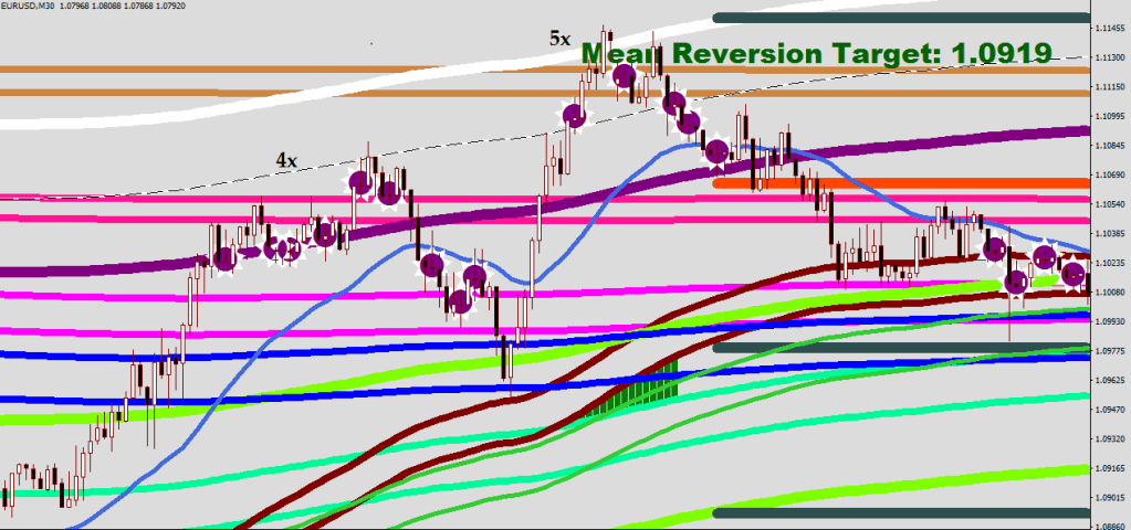 Since volatility has been coming in, I see the odds favor a similar return for a whip, that should probably materialize at 1.0850 or so, where price would come into both Mr. Maroon and the Lower Guard Rail.