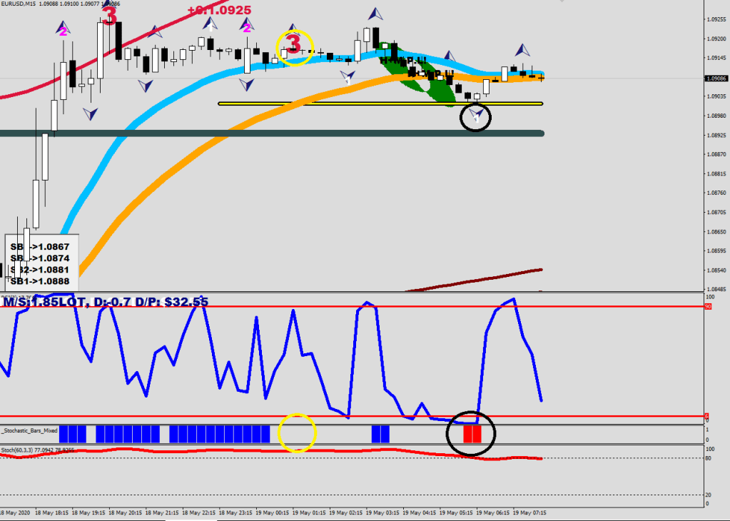 On the 15-minute you need to see a fractal without stochastic bar print (yellow example).