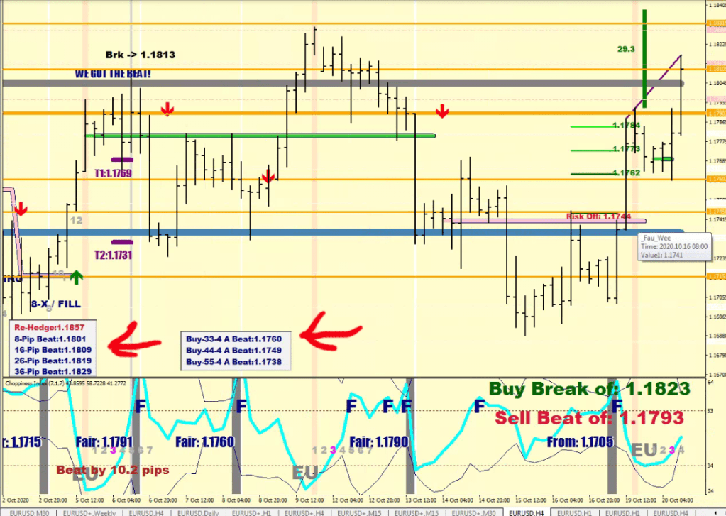 20 pips into the overbought / oversold field you can bet on the back test of the current consolidation range’s overbought / oversold level, and a certain 20-pips move is nothing to sneeze at when the certainty is high. Scaling / adding to the position moving further against you is advised, for the first penetration into the overbought / oversold would get rejected back. Do not try to go in at the same level again.
