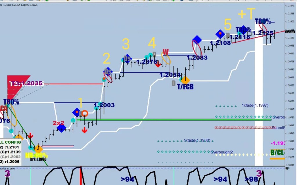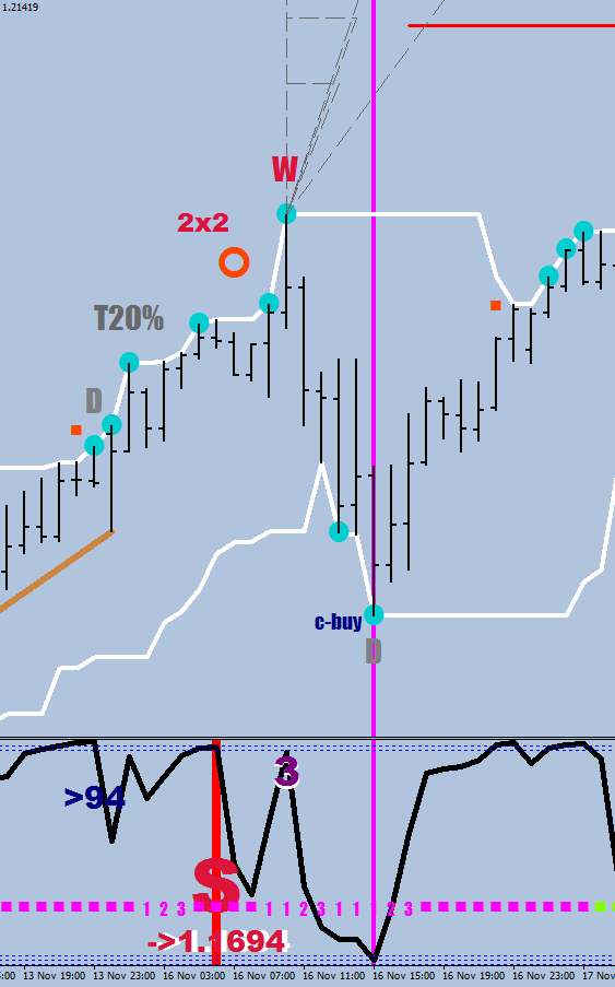 As a remark, just as No Drive has a 15/20 pips moratorium depending on comfort overbought/oversold or not, the Thrust also has this feature (20/36 pips – the blow off would prosuce that), and can happen multiple times with some offset before the settlement is final. The actual top came in at 1.21749 cca 36 pips above the 2nd thrust – no surprise.