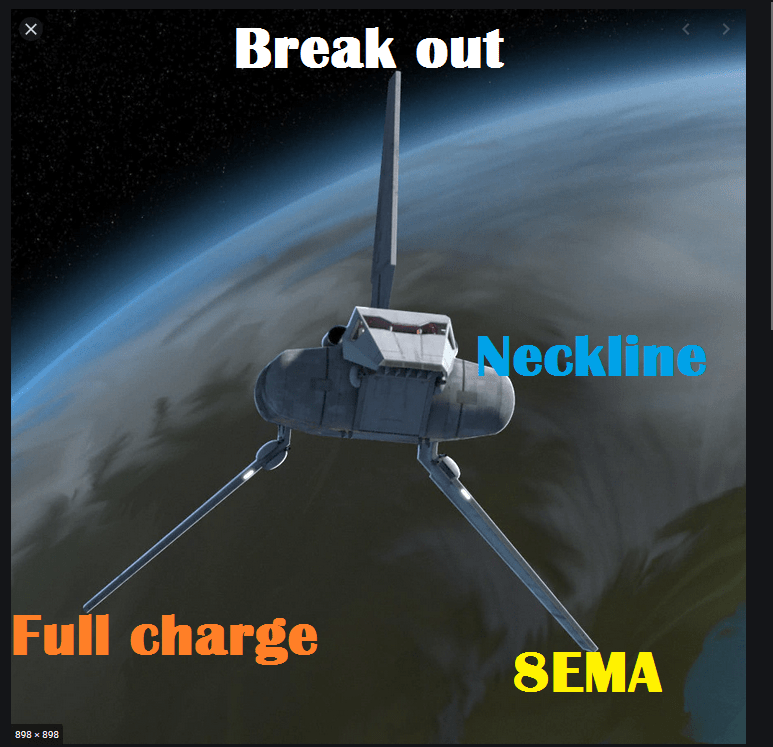 The 4-hour bar was picked correctly, but what is important here is the horizontal level, the blue diamonds representing the overbought. The high charge and the 8EMA alignment are important, but crossing back above the overbought neckline is the confirmation / trigger. Below that you are jumping the gun.
