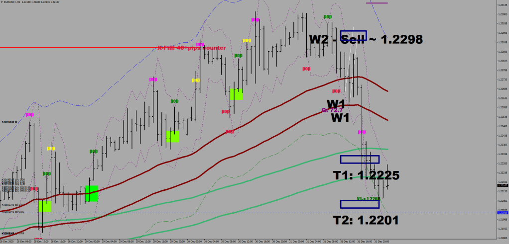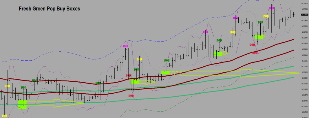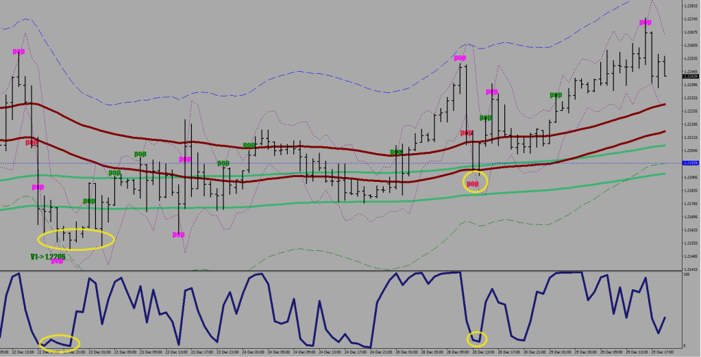 How does getting in after two downside Pops sound? Optimal. The purple dotted bands? 10-pip displacements of the previous hour’s lows and highs.