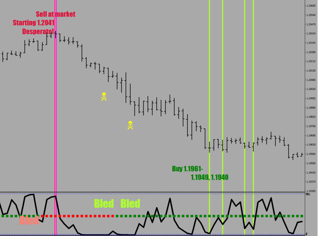 The vertical line determines a point in time when the divergence took place if the next 30 minutes starts with absolutely no kick back / recoil. These lines get a magenta accent to draw attention to the urgency: you have to go in in the opposite direction at market ASAP. “El Desperato” stands for a desperate action, and similarly on the receiving end the turn would likely come with a sense of urgency.