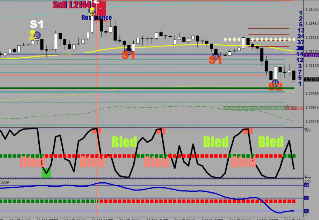 The overbought and oversold are 64 pips away (2x 32 = fluctuation size of EUR/USD).