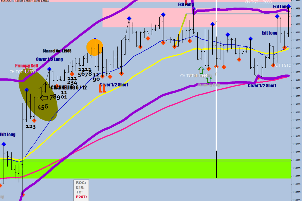 A start of a channeling move on a chart shows up as price separates from the E-16 HL2 hourly EMA and gets stopped and reversed on the next 2 attempts when it tries to return to it.
