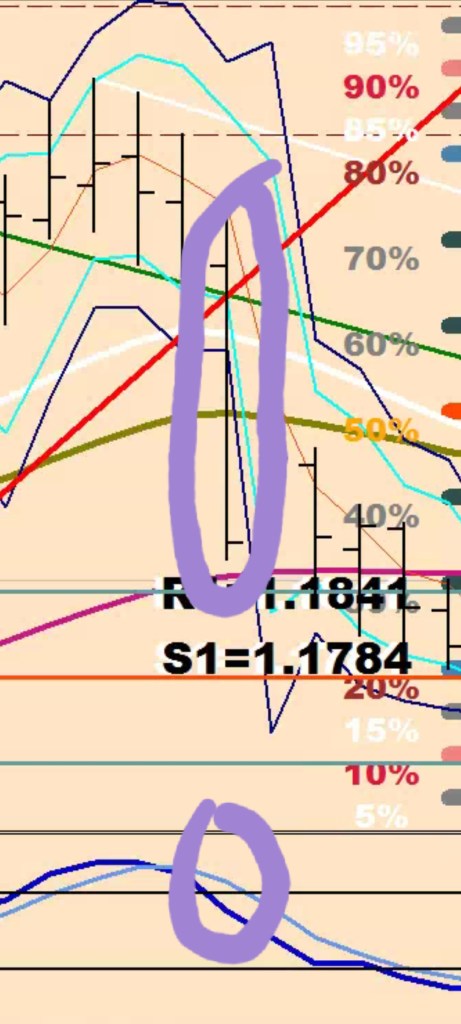 to appreciate what is at risk here, take a look at what can happen when the last week”s range gets exceeded by 50% (navy line) and simultaneously the overbought/oversold status gets lost: