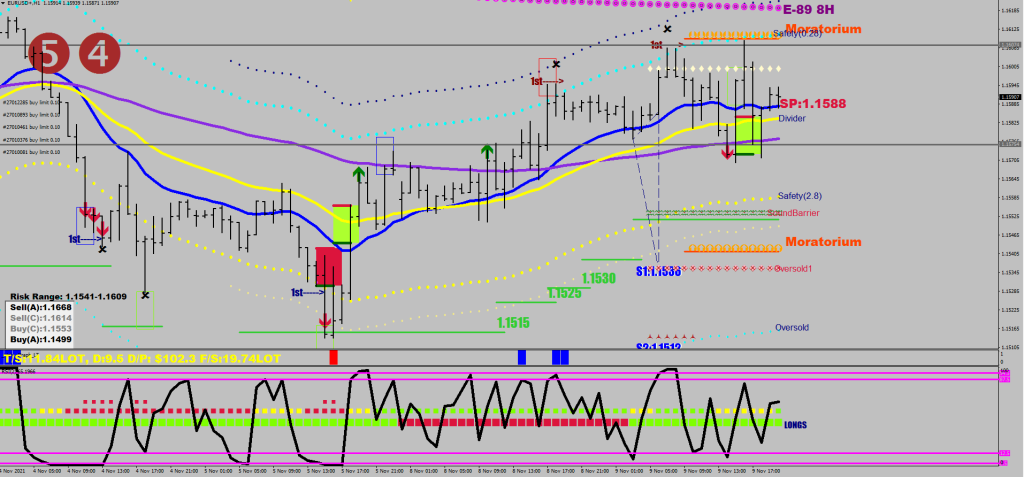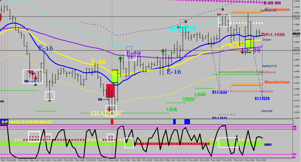 When you have 2 squares of the same color and the Stochastic Bars Hybrid has a corresponding peak signal, that’s an immediate buy/sell signal and the targets are the safety and the shadow lines at the opposite end (vertical lines).