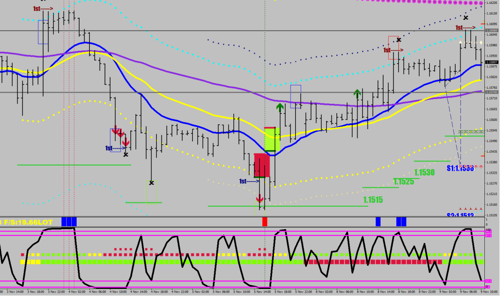 Yes, I left in the Forest, the 4H overbought / oversold levels, and a bunch of other stuff. You only need to pay attention to the dotted lines, the moving averages and the 3 rows of cubes printed onto the RSI below.