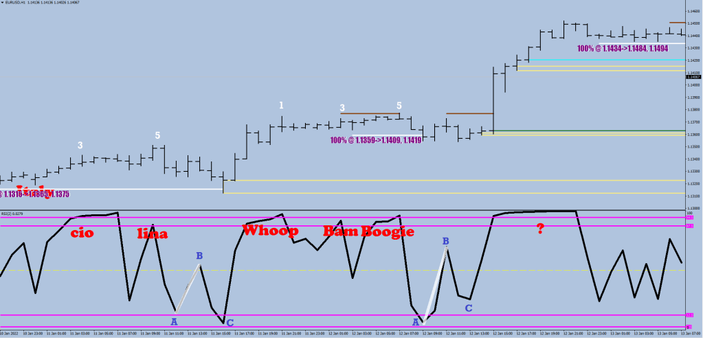 B is going to show up as a cross back up/below the 50 and would be occurring with highly subdued volatility. In EUR/USD terms this means a limit order 16-24 pips away from the most recent low / high made by wave A.
