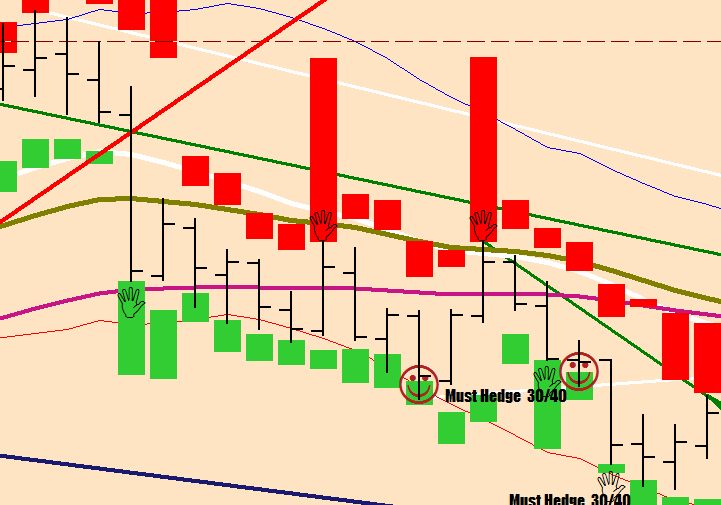 Just as I could define the bear and bull market switch off on the daily chart as “3 constructive closes above / below God”, on the Weekly I have the E-55 HL2 as the line in the sand, and what I was missing is this being uniform. Now, the smileys (Market Mode) are prompted by well defined lines (E-59 is a factor as well). No more dual standards.
