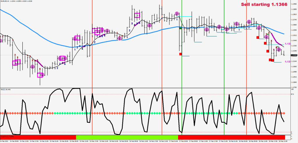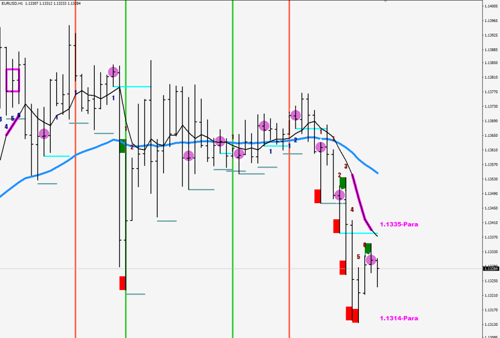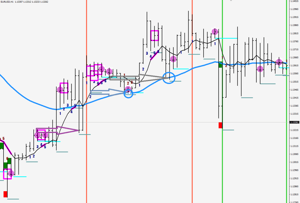 3 hourly closes with neither of them more than 7.5 pips from the other (magenta boxes) or a break of the most recent pressure wick that is in excess of 3.6 pips (red and green squares).
