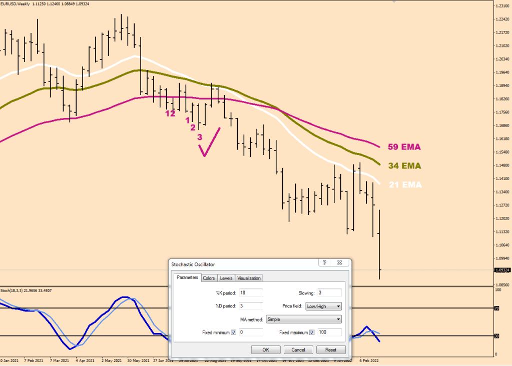 All EMAs are HL2s. The image shows the market going into bear mode upon 3 weekly closes were made below the 59 EMA. As you can see from then on the 21EMA proved to be a good short entry.