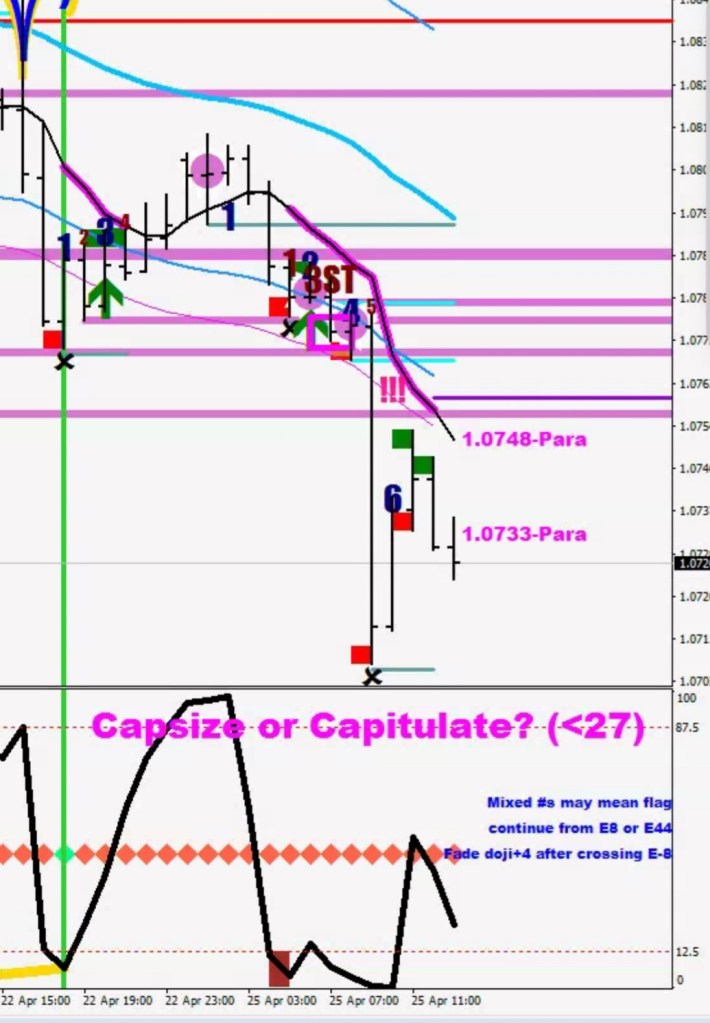 These, reflex counter moves start right outside the pendulum bands and result in a counter move that gets capped either by the hourly E-44 or a slight beat of a new born doji (i.e. 4 pips).
