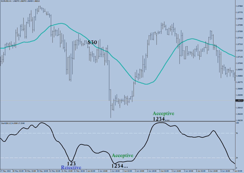 The 4-hour stochastic can be acceptive or rejective.