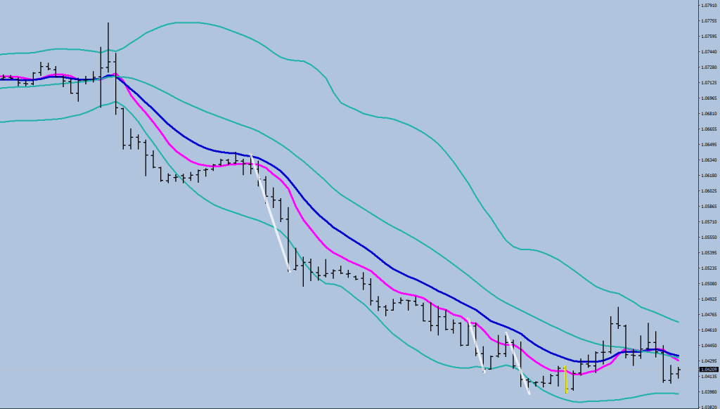 Let’s acknowledge this trending move down. Every time price pulled back to between the 8EMA of opens and the 16EMA of halves, they sold again and price moved below the 30-sample Bollinger Bands (white lines), until once it did not (yellow). That was the end of the leg.