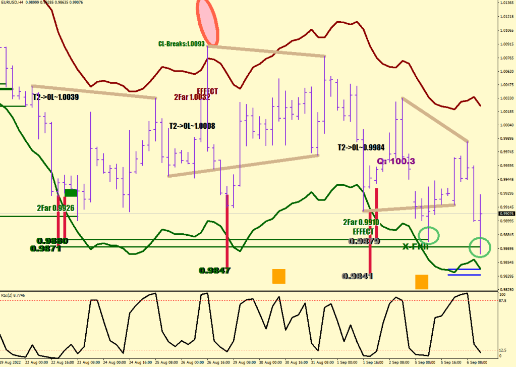 The brown lines are RSI2 continuation divergences. The Overdrive bands we have discussed already. 2Far means price has gotten too close to the Overdrive. Effect means, price has pierced it. The Q: is the 3-day average ATR. 100.3 pips currently.