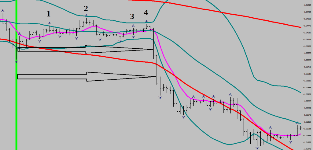 This is measured by the 30-smaple Hourly HL2 Bollinger Bands where a 36+ pips outside would qualify,