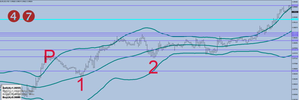 The first suspect entry for the #1 is the middle band (60-SMA HL2) if price does not stop there, cost averaging on the other side is an option, see the image above.