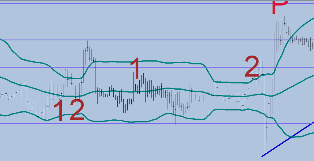 In a sideways market (a squeeze) the muted moves would also have a 5-wave structure, but the second entry would actually be an undercut of the low or a beat of a high. Brown numbers. Yes, the second #2 looks like a Pop of the bands, but you would need more slack on boths sides, like the P to its right, which clearly managed to set the new direction for good.
