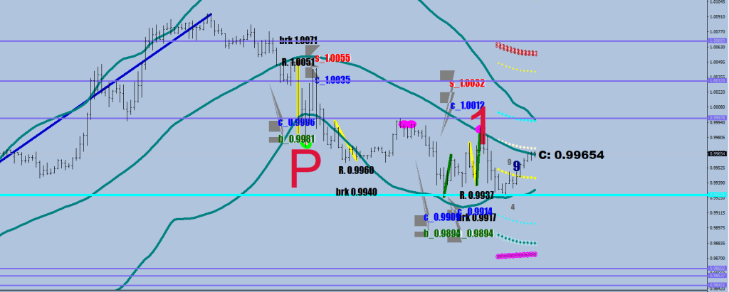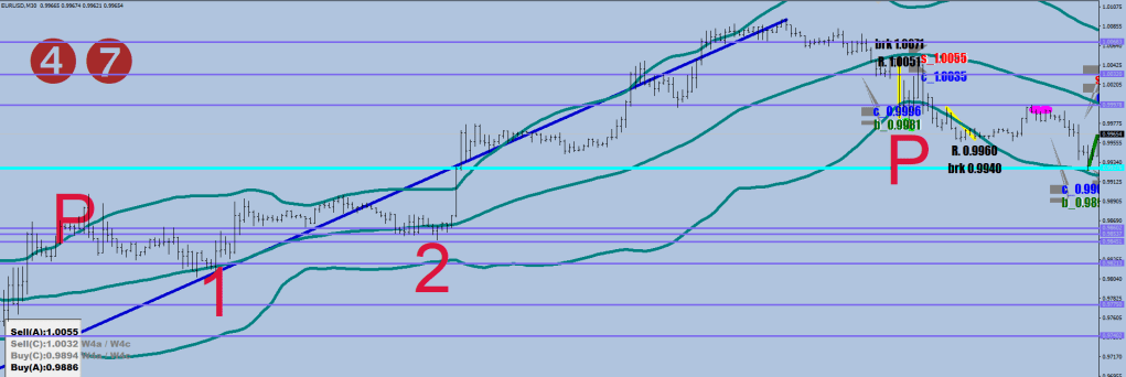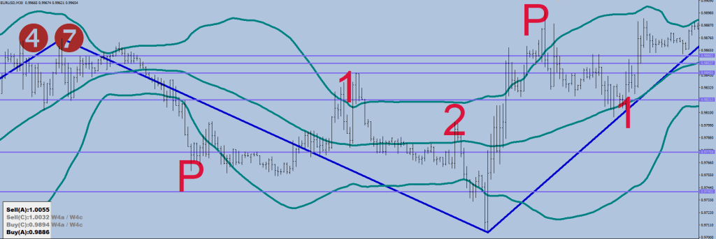 So the current possible outcomes are: if price goes outside the BB on top first, double down on the shorts, move the #1 print, as the direction is down for 3 more legs from that point on.