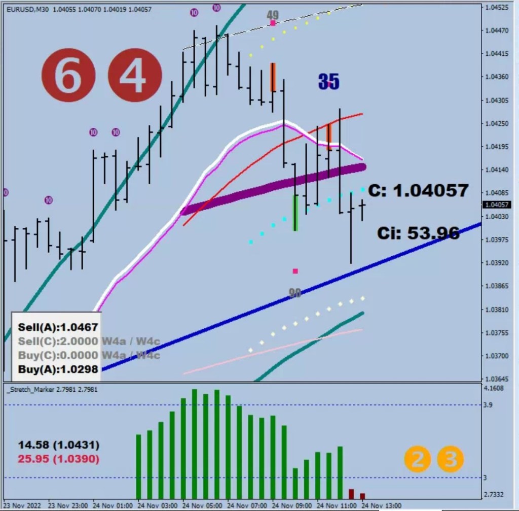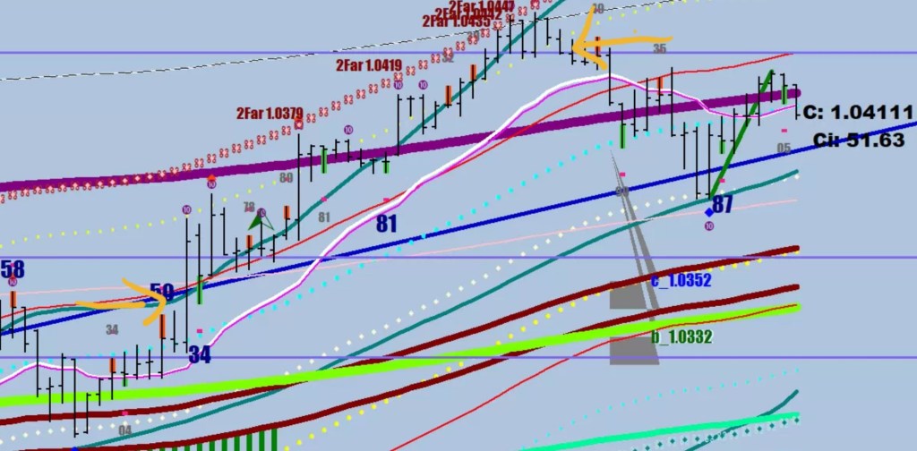 The bottom left 10-sample max distance from the EMO8 and the bracketed perceived resistance & support levels based on this data. “Volatility/couter volatility”