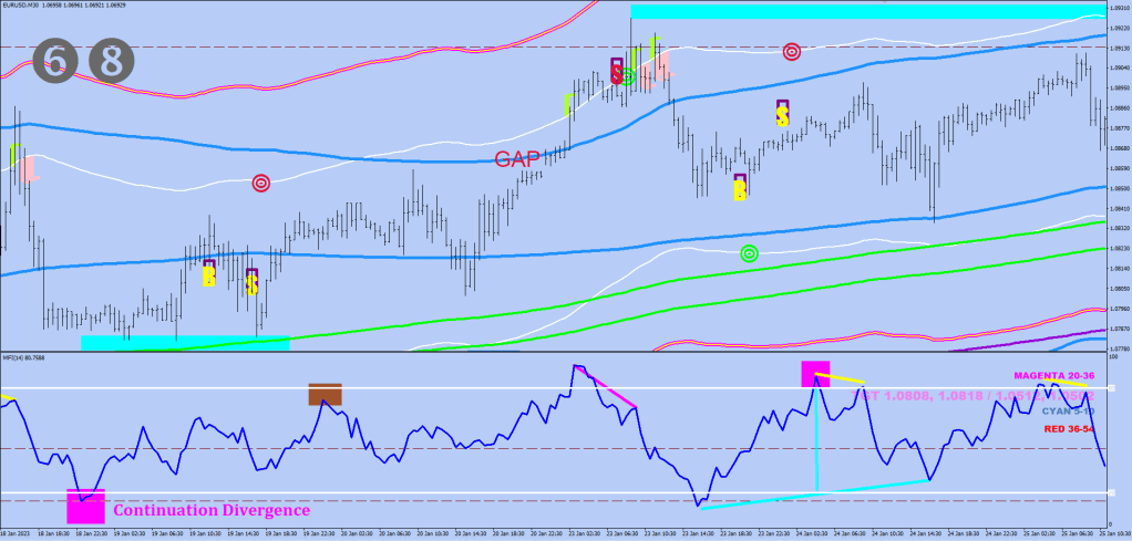 The continuation divergences are where you should commit the bigger money. I use the two Maroon interrupted lines to know when a pullback went too far on the money flow.