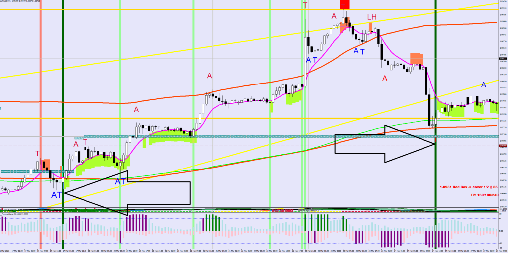The violation typically happens in 2 steps. One 25+ pips stab into the displacement (20 pips from the trigger high / low) for a 45-pip fluctuation maximum proof. Then a pullback / dip back into the Risk Range for a Kiss Goodbye. I circled the adjustors below.