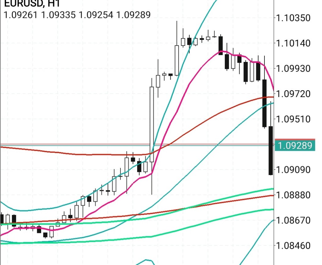 The market is in the resting range. 1x stretch is the bending position before the run from the guard rails. There is a LEMA at 1.10 (sienna). Also is about 3x stretch (purple) – it would make sense to at least stretch out that much before a snap back.