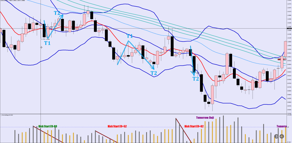 My thinking is that a new leg is going to come start from beyond the 9-day EMA (HL2 – in red) with some displacement and then the market would engage in challenging the daily Bollinger Band. No guarantee that it would get there, but it should give it its best shot and make a lower low / higher high for sure.