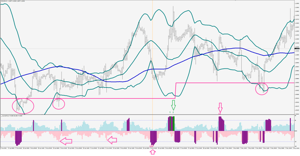 After the buy, the bigger stretches are the entries, say 50 or more in the negative or the 3rd purple print arrives. The Run Up is on until the second Green print appears. As mentioned before, a full body outside the Bollinger diqualifies the counter for the first count. After the close of Green 2, the market is in the correction, down to the joyce line. Similarly, the get in is the 50+ stretch of the 2nd purple close.