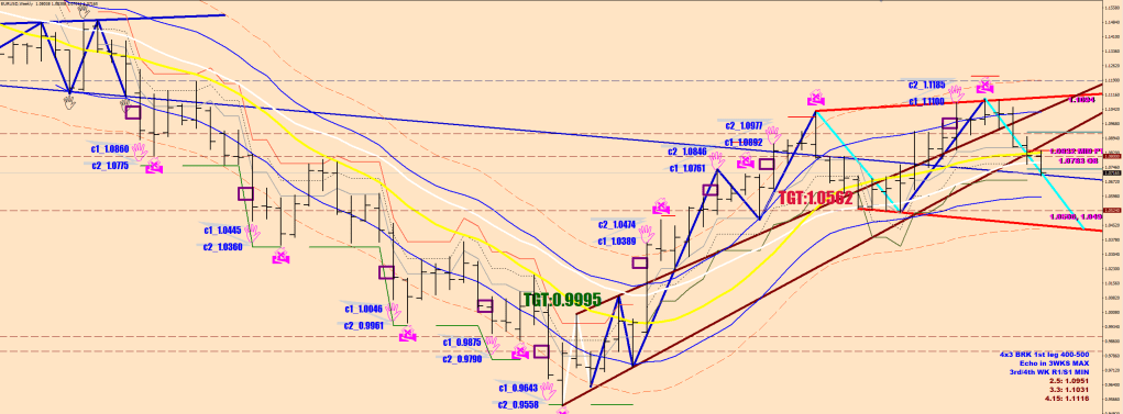 Things would probably happen rather slowly: the B leg up would take a week and a half perhaps (5-7 days) and the C leg down could take as much as as 4-5 weeks. The B leg ultimately could tag the interrupted line at 1.0910.