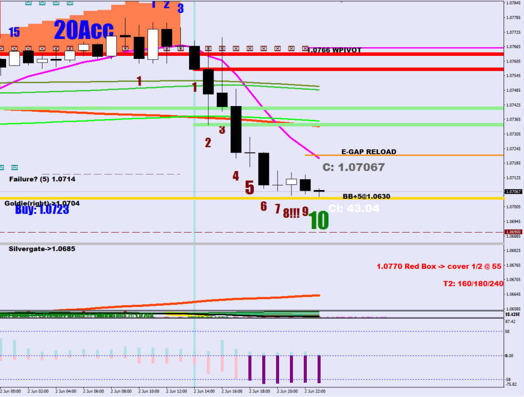10 Hours of intensive selling (14 hours of correction) doubling down on support. Interesting that Goldie (buying the right for a no break extension) is not getting violated even with the increased spread. In an uptrend you want to buy weakness. The purple bars (2+) are a sign of weakness.