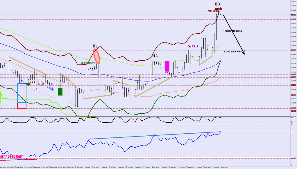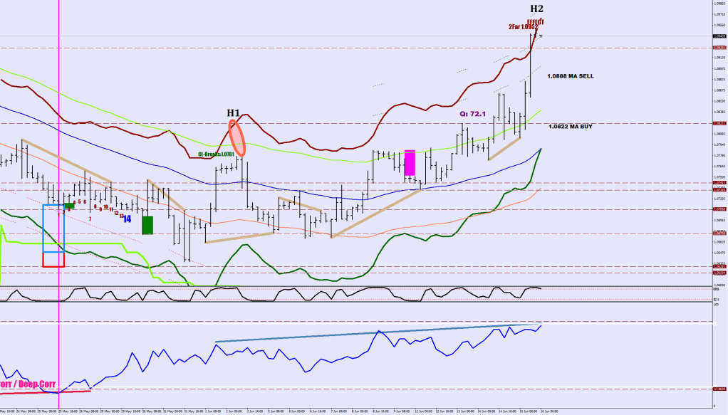 Channeling is keeping the price on one side of the 9-DAY EMA, a correction is slipping to the Guard Rail on the other side, a deep correction is going a further 60 pips. Extra deep would be 100 – that’s the second interruptd line out.