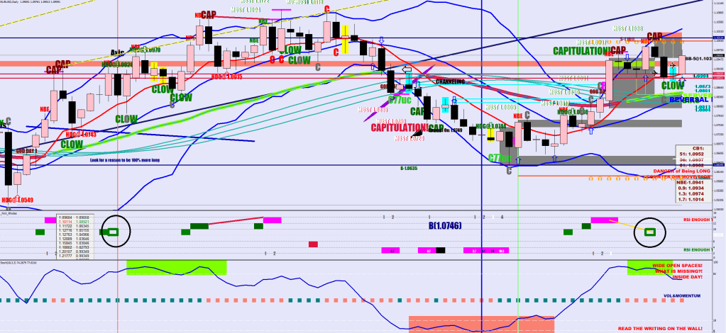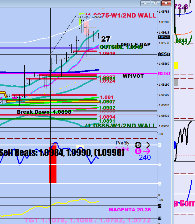 The idea of looking back on the MFI peak from 6 hours later to figure the 3 displacements (8, 14 and 28 pips) is not bad. There was a squeeze break to the upside, and the steepness currently isn’t in line with the norm. Yet, if you put the pointer above the Stoch overbought MFI peak and measure 28 pips from there, you get 1.0971, which was within 5 pips of the actual peak.