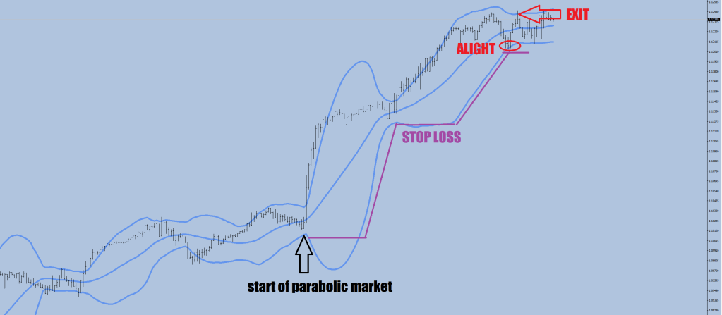 It is a sign of a parabolic move in itself that price does not touch one end of the 30-sample 30 minute BB. When it finally does, there would be one final hurray that is likely going to tag the other end one last time.