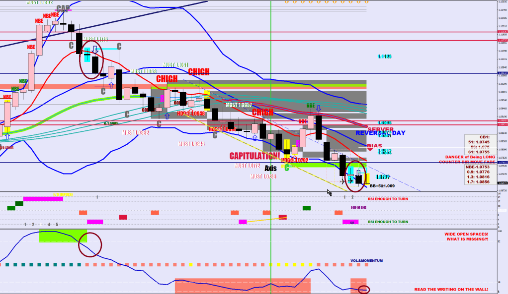 The downside stoch room difference between the two low close pro volume candles is huge. I would suggest that the pros dumped most of their holdings, but not all. The 160-pip rally would mean 1.0845 for the rebound. The script may still be valid, as the BB will continue to get closer every day.